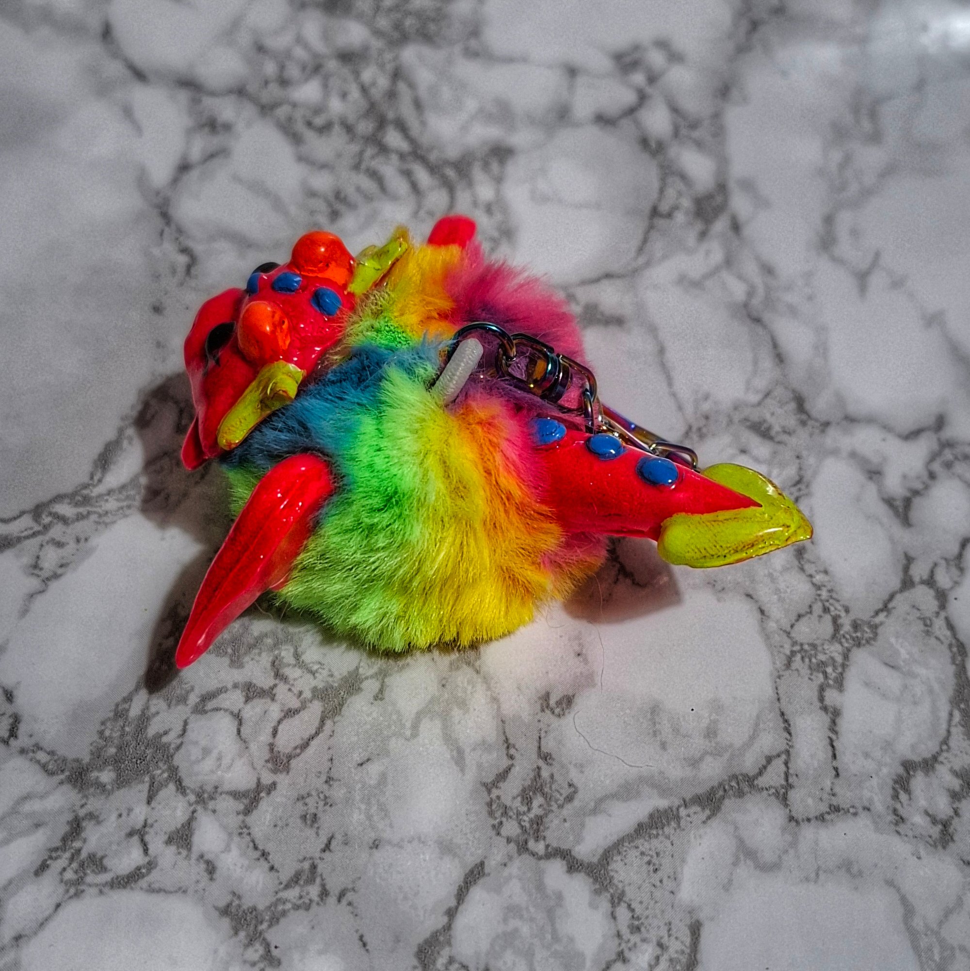 These are lightweight keychains made from polymer clay and then coated in resin. The head, tail, and wings are attached to a pom pom.